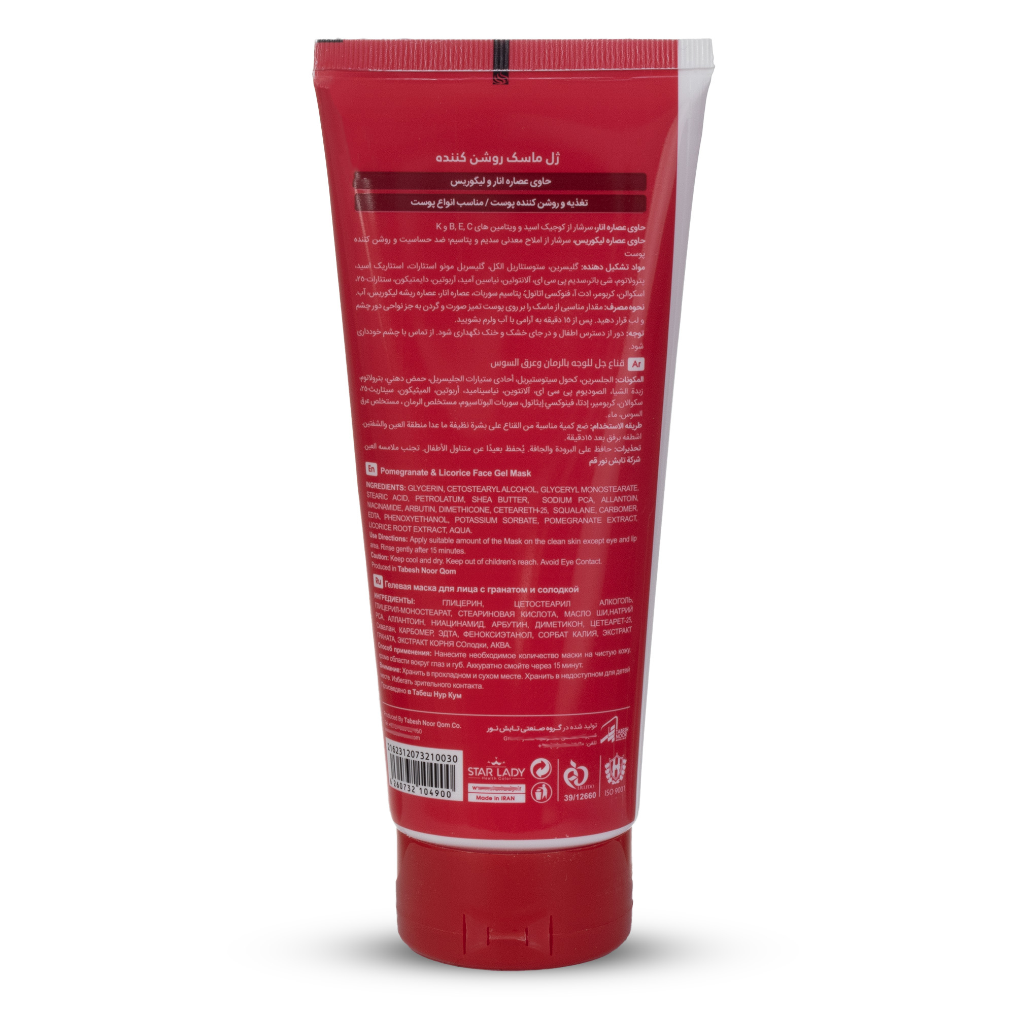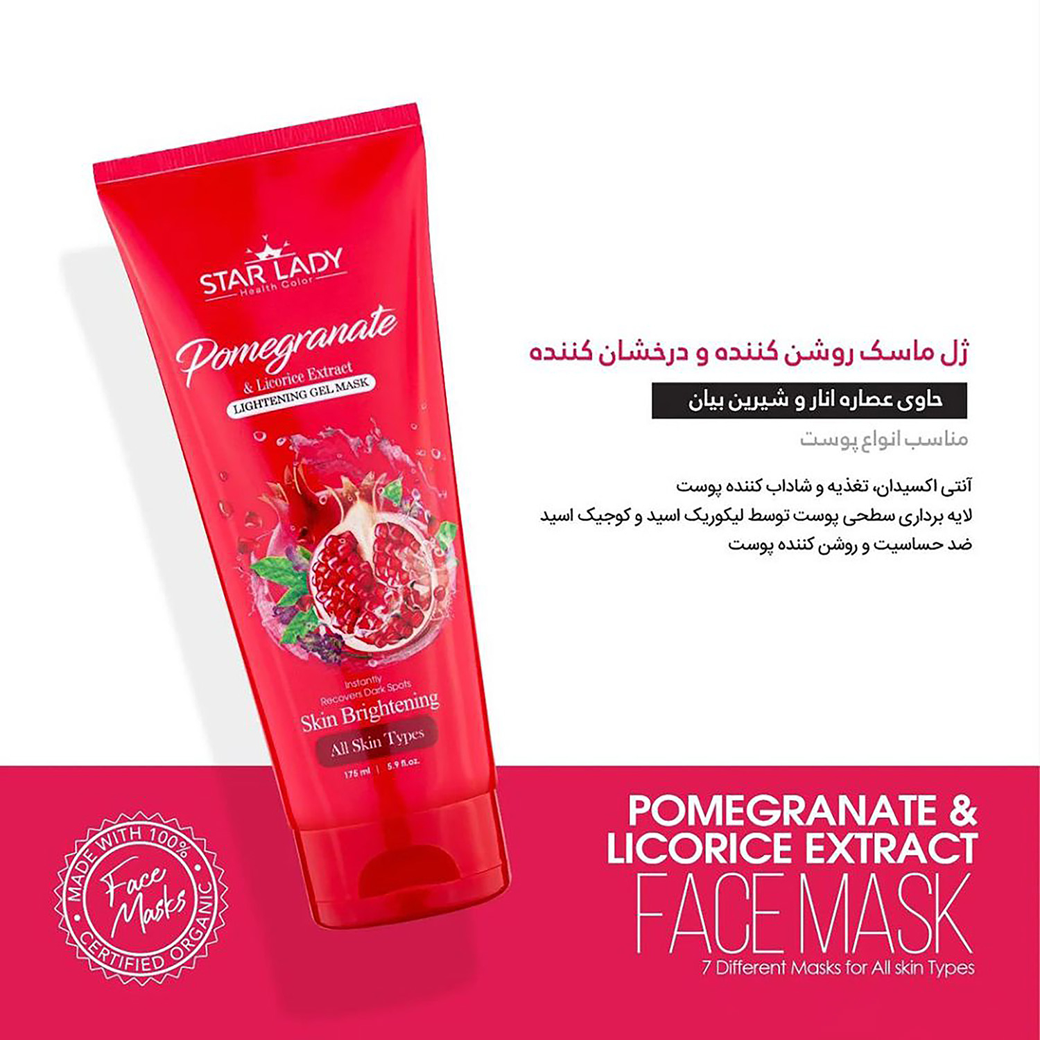 - سایر توضیحاتویژگیهای اصلی باندل ماسک استارلیدی حجم هر ماسک: ۱۷۵ میلیلیتر نوع محصول: ژل ماسک و ماسک رسی (برای مدل خاک رس) موارد فاقد: پارابن و فتالات مناسب برای: انواع پوست ماسک جوانساز (هویج و سویا): تحریک کلاژن، آبرسانی، کاهش چین و چروک ماسک روشنکننده (انار و شیرین بیان): کاهش لک، یکنواخت کردن رنگ پوست ماسک آبرسان (خیار و ذغال اخته): آبرسانی عمیق، افزایش خاصیت ارتجاعی ماسک آبرسان (آووکادو و بابونه): تغذیه و تسکین پوست حساس، کاهش التهاب ماسک کنترل چربی (گریپ فروت و خاک رس چای سبز): پاکسازی عمیق، کنترل چربی، کوچک کردن منافذ ماسک ضد جوش (لیمو و نعنا): پاکسازی عمیق، لایهبرداری ملایم، ضدباکتری ماسک ضد جوش (ذغال فعال و شیباتر): رفع جوشهای سرسیاه، جذب چربی، کوچک کردن منافذ این محصول شامل 7 مدل ماسک استارلیدی هر کدام در حجم175 میلی لیتر میباشد.