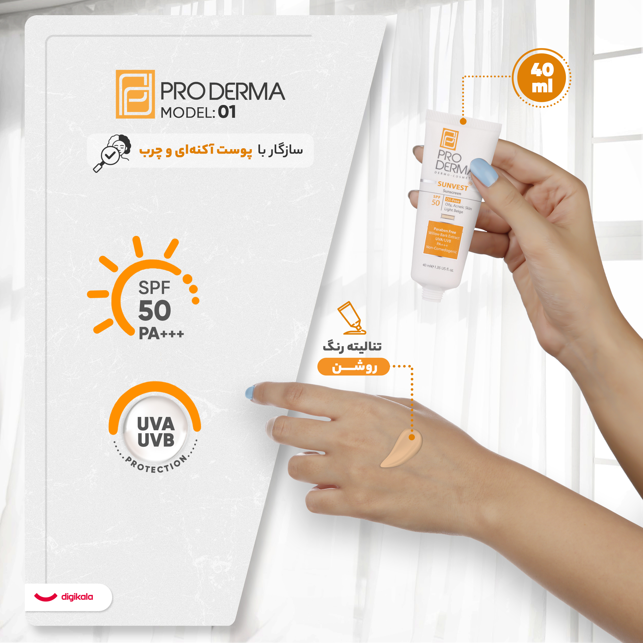 کرم ضد آفتاب رنگی پرودرما SPF 50 مدل ۰۱ یک گزینه عالی برای محافظت از پوست در برابر اشعههای UVB و UVA است. این کرم ضدآفتاب دارای SPF 50 و فاکتور محافظتی Pa+++ است که به خوبی پوست شما را در برابر اشعههای مضر که منجر به سوختگی و پیری زودرس پوست می شود، محافظت میکند. همچنین، این کرم ضدآفتاب مناسب برای پوستهای چرب است و دارای بافت بدون چربی است و بدون ایجاد حس سنگینی و چربی جذب پوست می شود. این کرم ضدآفتاب بدون مواد شیمیایی مانند پارابن تهیه شده و با پیگمنت های رنگی برای استفاده بانوان مناسب است. همچنین در تولید این محصول از عصاره درخت بید سفید استفاده شده که حاوی مقادیر زیادی اسید سالیسیلیک است و برای رفع التهاب های پوستی بسیار موثر است و به هیچ عنوان موجب ایجاد کومودون های پوستی نخواهد شد.