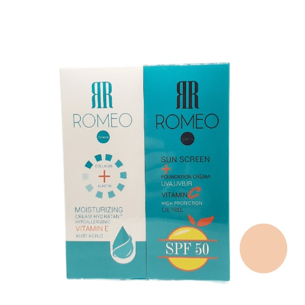 ست کرم ضد آفتاب رومئو حجم 40 میلی لیتر به همراه کرم آبرسان رومئو حجم 40 میلی لیتر و SPF 50 . این محصول دارای ویژگی هایی نظیر : خاصیت ترمیم کننده سلول های مرده پوست، پوشش دهی ، کاور فوق العاده بالا ، پایه آرایشی ، آبرسان پوستهای چرب ، فرمولاسیون سبک ، بدون احساس سنگینی بر روی پوست ، ماندگاری طولانی و دارای عیار حفاظتی SPF50 جهت محافظت پوست از اشعه های مضر نور آفتاب میباشد.