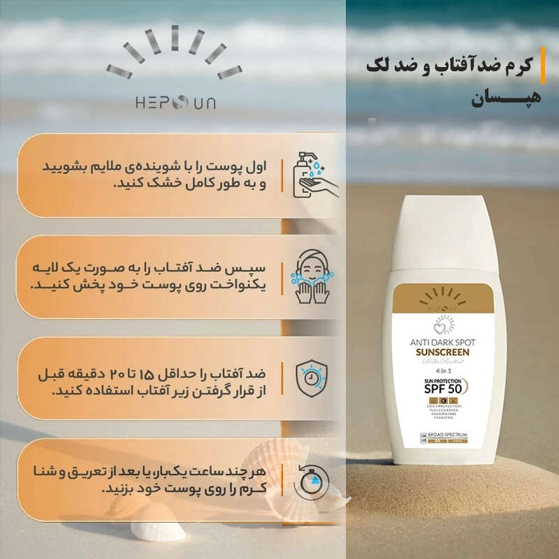 کرم ضد آفتاب بژ طبیعی هپسان علاوه بر مراقبت پوست از آسیبهای ناشی از پروتوهای فرابنفش خورشید، دارای اثرات مثبت دیگری در مراقبت پوست میباشد؛ از جمله این موارد خاصیت ضد لک بودن آن می باشد که با دارا بودن ترکیبات موثر به مرور باعث از بین رفتن لک های پوستی ناشی از تابش آفتاب بر روی پوست می گردد و پوست را روشن می نماید. این محصول به صورت تخصصی متناسب با نوع پوست شامل انواع پوست چرب و پوست خشک و حساس طراحی گردیده تا بتوانید محصول ایده ال خود را متناسب با نوع پوست خود انتخاب و مصرف نمایید و از این طریق از ایجاد مشکلاتی مانند مسدود شدن منافذ پوست ایجاد جوش خشکی بیش از حد و دهیدراته کردن پوست جلوگیری شود. از ویژگی های جذاب و بارز این محصول بافت فلوئیدی و سبک آن میباشد به طوریکه به سادگی بر روی پوست پخش شده و سریعا جذب میشود.